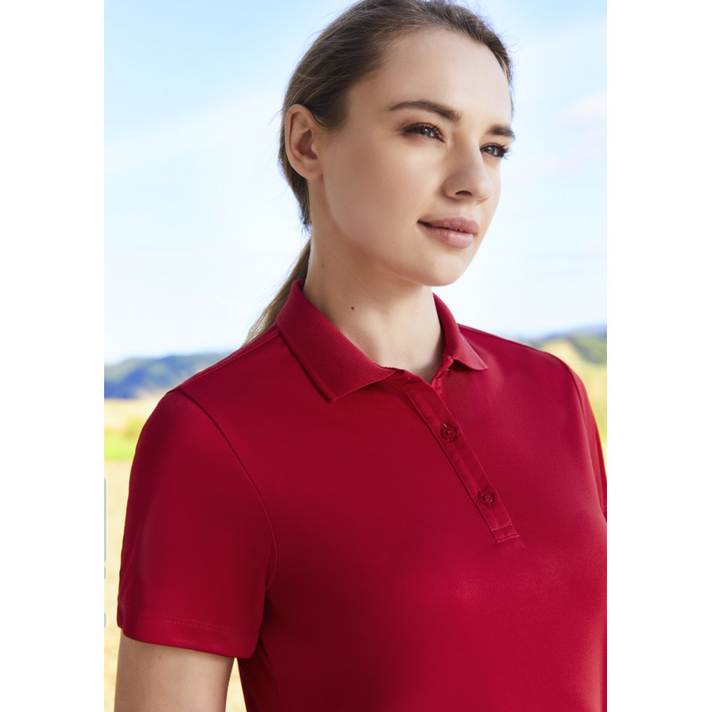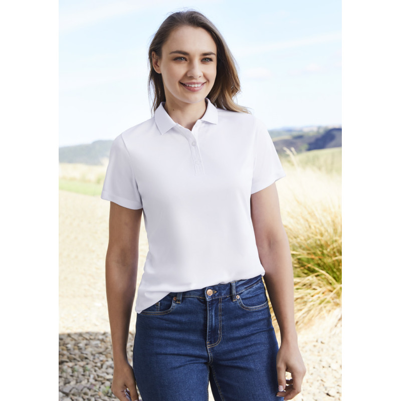 Luxe feel Cotton-rich jersey fabric feels cool and comfortable,Ladies style has a neat collar and flattering open neckline. Fabric: 75% Cotton, 25% Polyester, Plated Jersey,190 GSM.