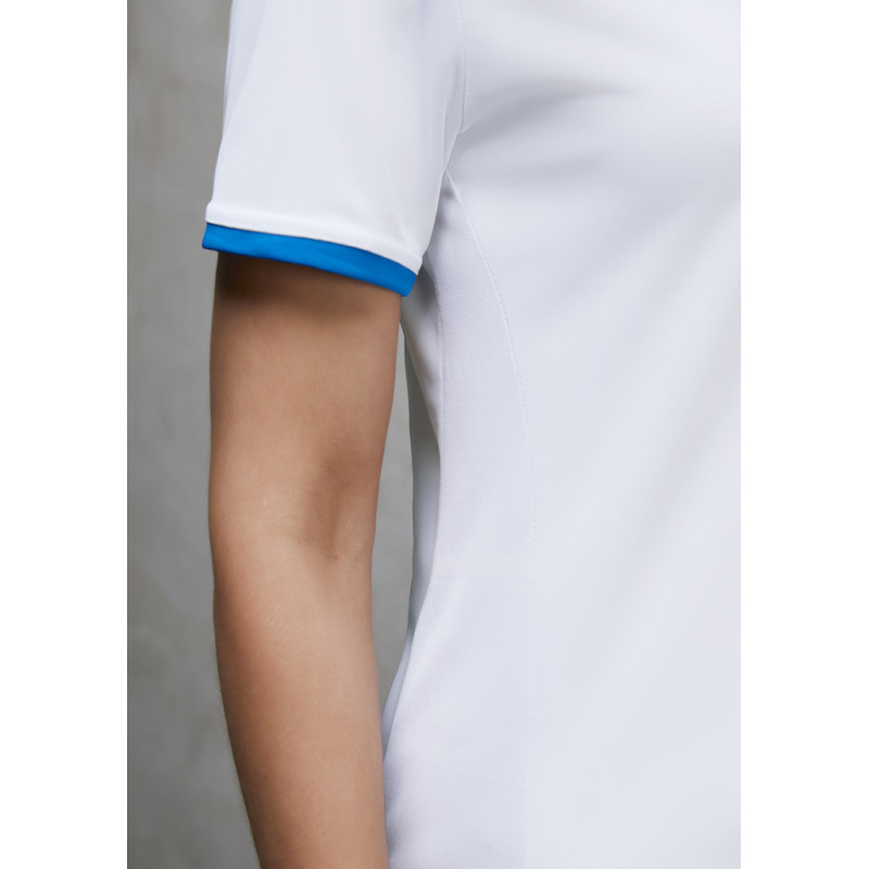 Luxe feel Cotton-rich jersey fabric feels cool and comfortable,Ladies style has a neat collar and flattering open neckline. Fabric: 75% Cotton, 25% Polyester, Plated Jersey,190 GSM.