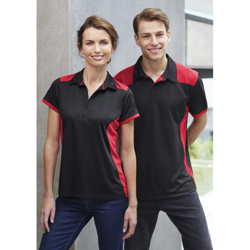 Honeycomb weave with stretch elastane delivers style and comfort,Flat knitted collar with contrast button placket,Side panels with dynamic contrast piping,Unique print features on torso, sleeve and back neck to accent your logo,Longer length for added coverage when moving,Mens style includes loose pocket. Fabric: 97% Polyester, 3% Elastane,180 GSM,BIZ...