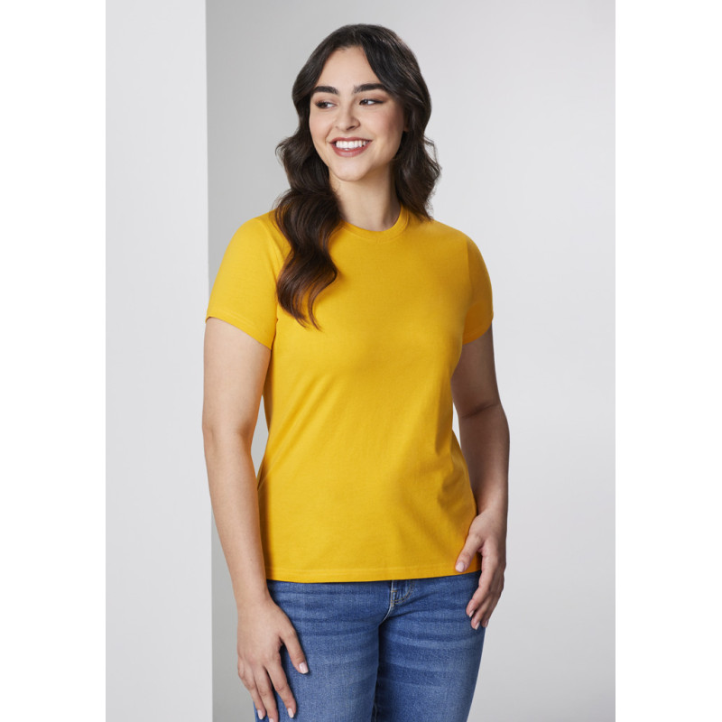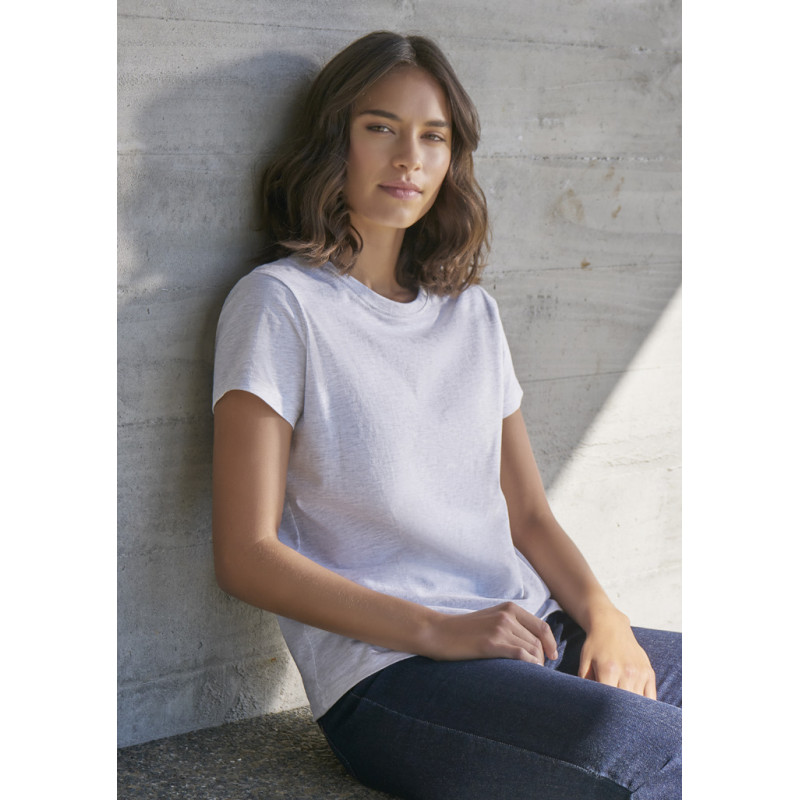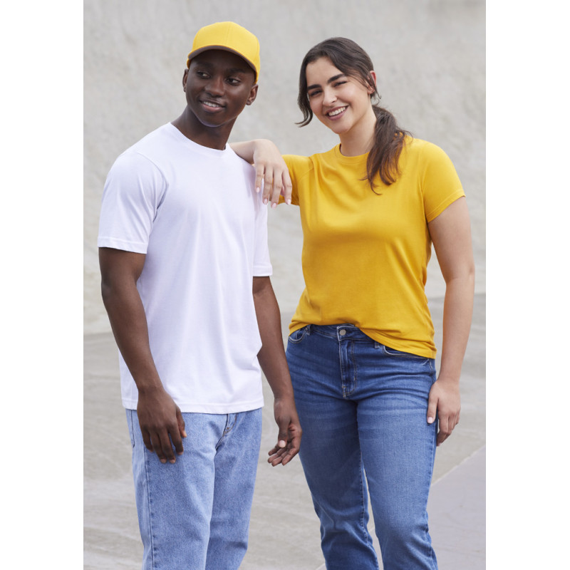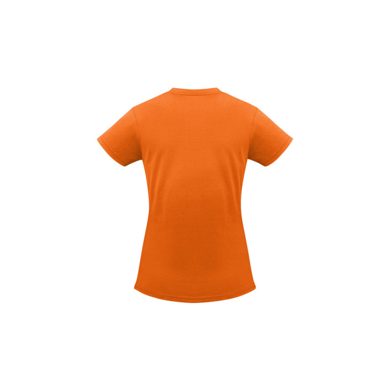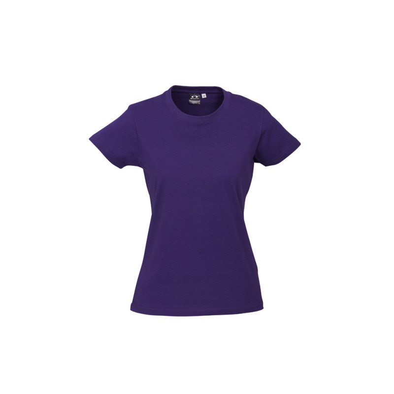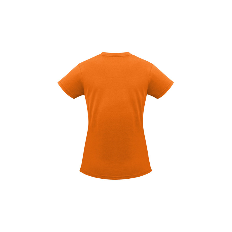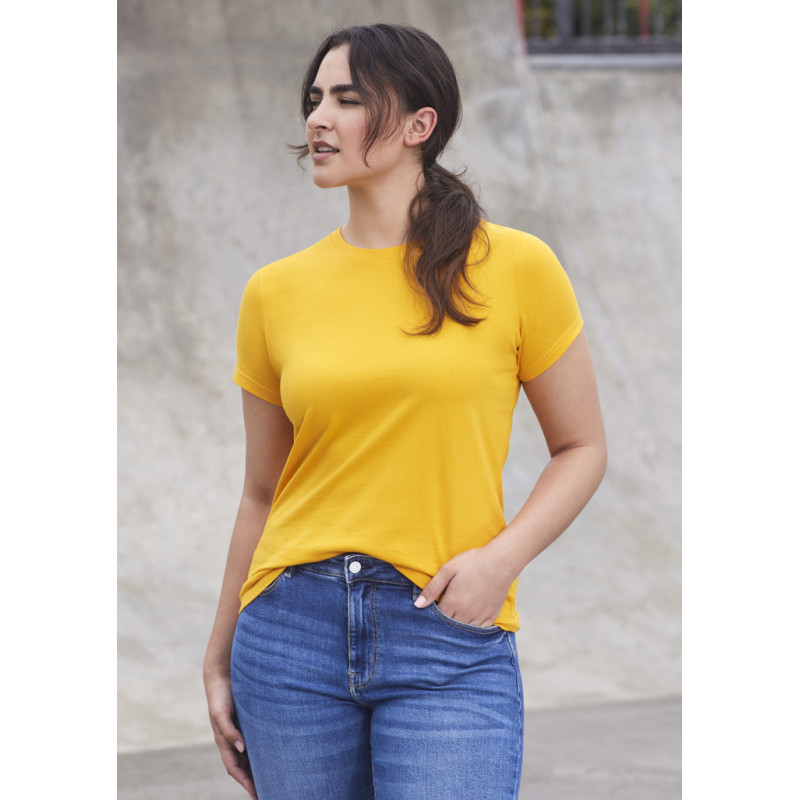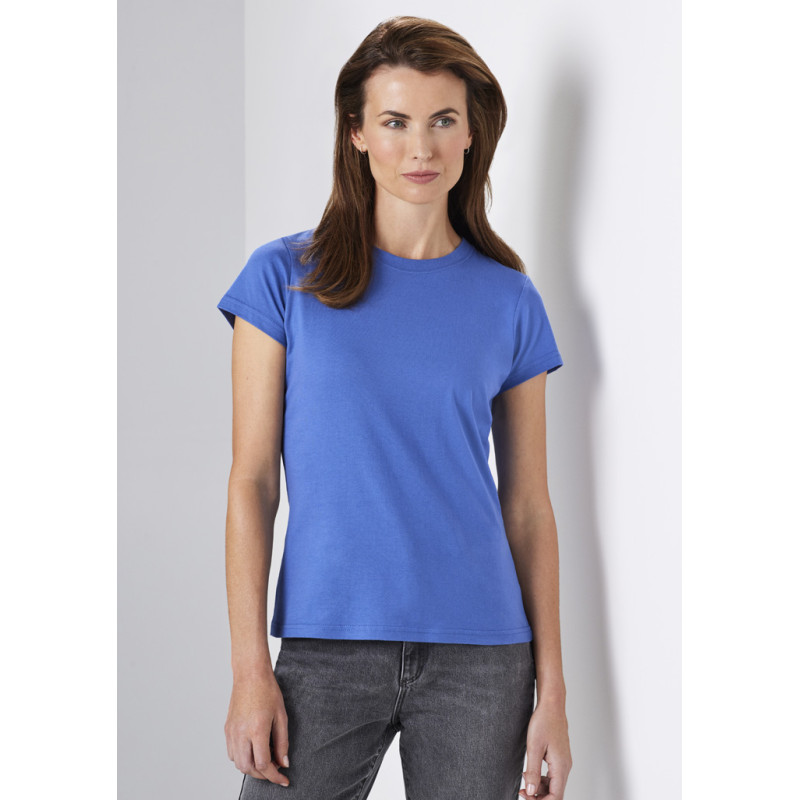 Stylish cut and sewn women’s t-shirt which features an elastane ribbed round collar with neck tape reinforcing and short sleeves. It is available in five sizes and is manufactured from 190gsm heavy jersey, semi combed ring spun cotton. This gives the garment a soft and smooth feel as well as providing an excellent branding surface.