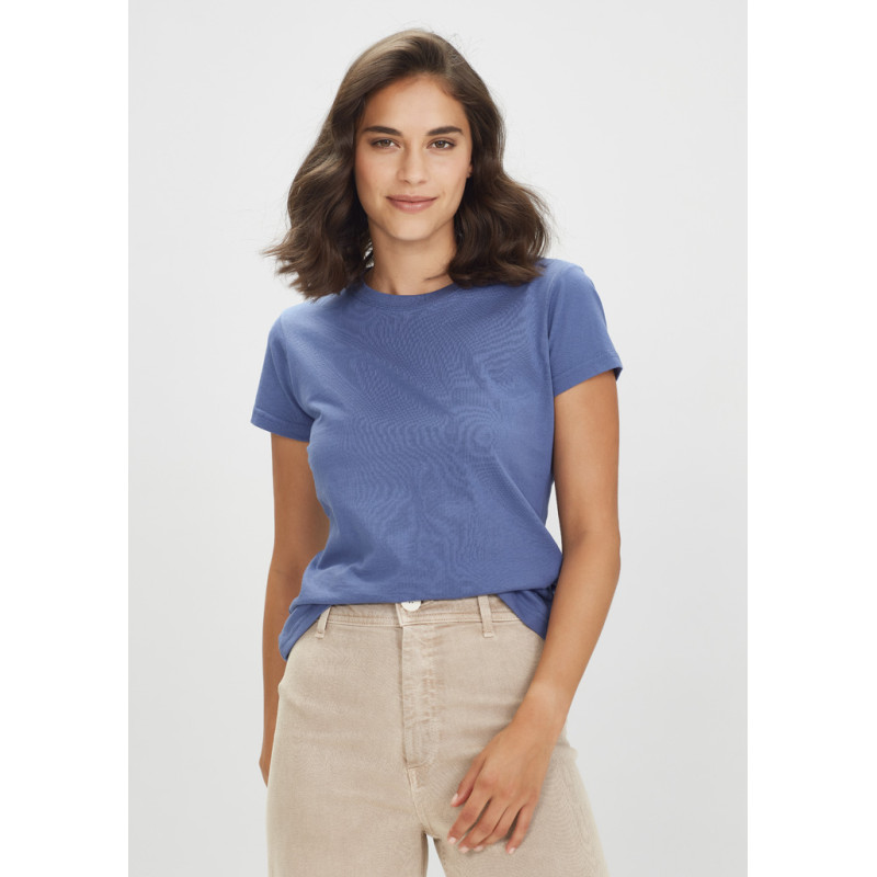 Modern T-shirt for women, with fashionable length and wide neck drop made of extra smooth combed ring-spun cotton. Fabric: 100% ring-spun combed cotton; single jersey|(GYH: 85% cotton, 15% viscose)|Weight: 145 g/m²|Fit: Body Fit|Sizes: S-XL|Care Instructions: washable at 40°C|Other Features: slim rib collar, wide neck drop, fashionable short sleeves with...