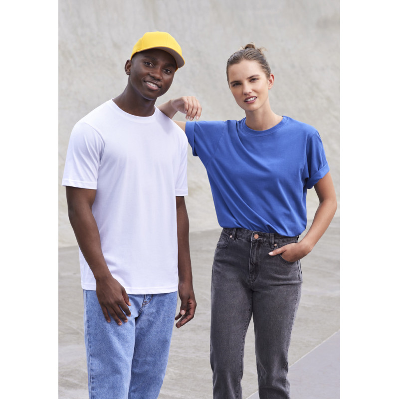 100% Cotton preshrunk jersey knit, 150 g/m² (141 g/m² in White), Deluxe 30's soft style yarns, Seamless double needle 1.27 cm rib knit collar, Tapered neck and shoulders, Side seam construction with stylish tapered fit!, Double needle sleeves and bottom hem, Quarter-turned to eliminate centre crease