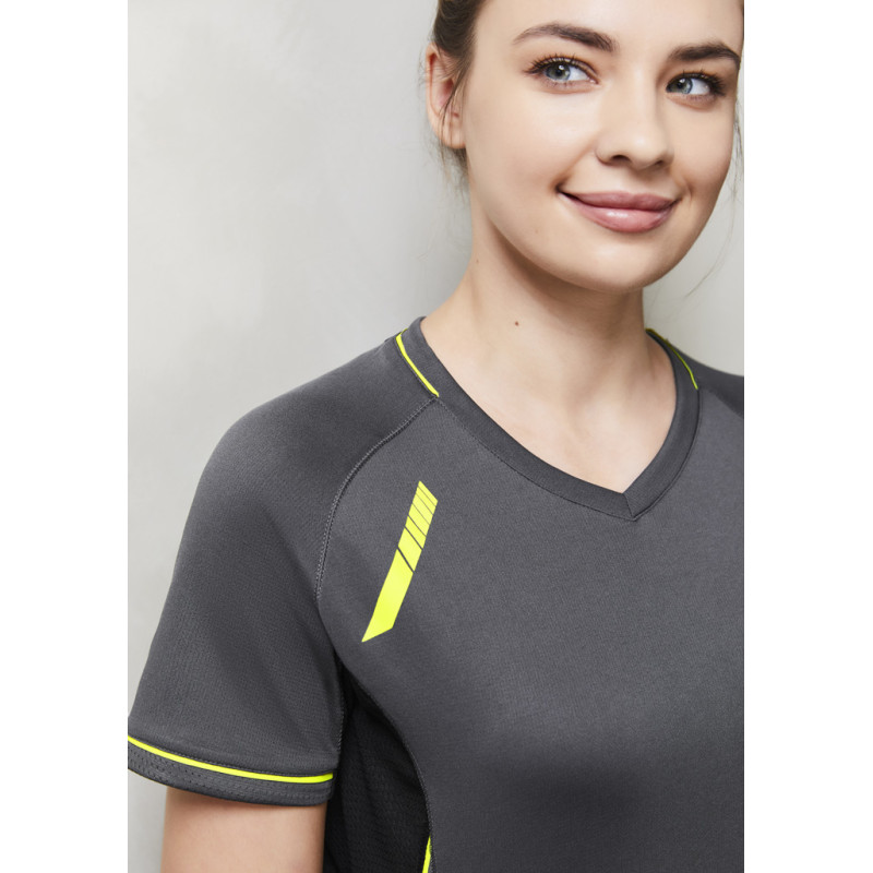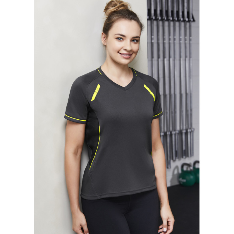 Smart womens cut and sewn, short-sleeved V-neck t-shirt. It is manufactured from a blend of viscose and 190gsm heavy jersey, semi-combed ring-spun cotton which gives the garment a soft, smooth feel as well as providing an excellent branding surface. The elastane ribbed collar has tape reinforcing to strengthen and maintain the collar shape. The t-shirt is...