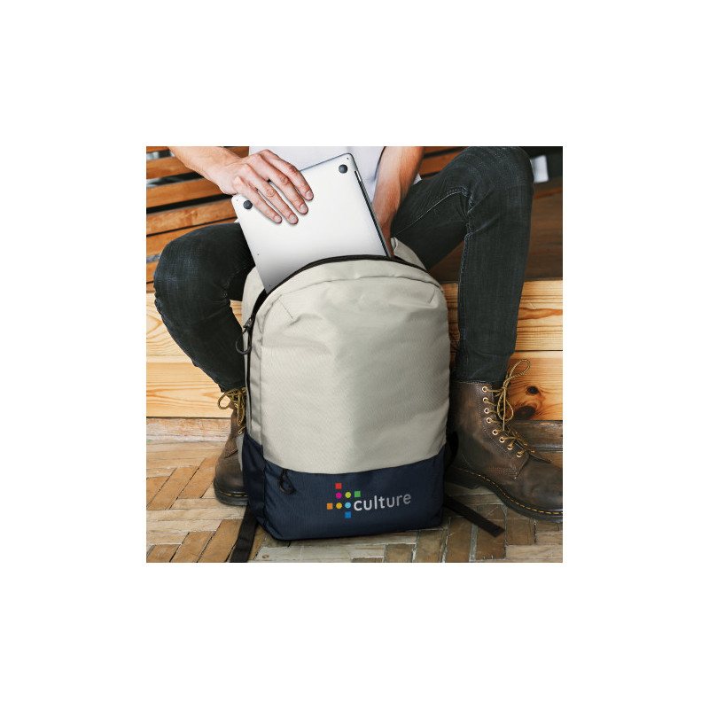 The handy and easy-to-haul Chicago backpack works as well on the streets as it does in the office. With a double zippered large main compartment that contains a padded laptop holder it holds all the gear you need. Combined with modern styling accented with PU leather it looks good for your daily commute. 600D polyester with sublimated print/PU...