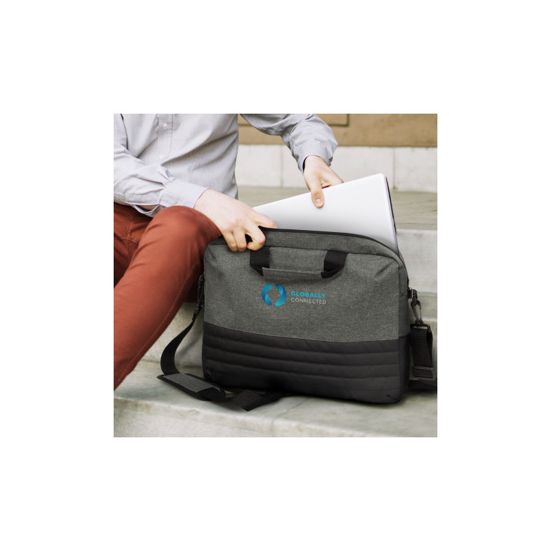 Sturdy laptop bag with padded compartments for both a laptop and a tablet which is manufactured from highly durable poly-leather. It has a large zippered pocket on the front, woven carry handles with a Velcro cuff and an adjustable woven shoulder strap.