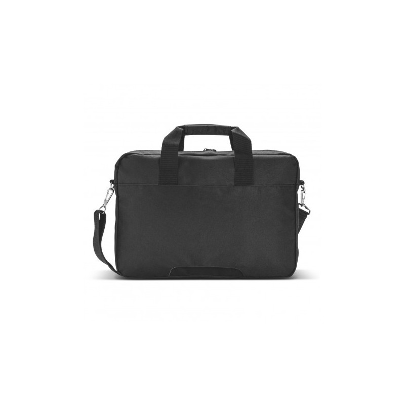 600D polyester with heavy vinyl backing standard briefcase. Main compartment with zippered closure, front flap has zippered pocket with dual buckle closure, various sized slip pockets and pen pockets under front flap, single carrying handle, adjustable and removable shoulder strap.