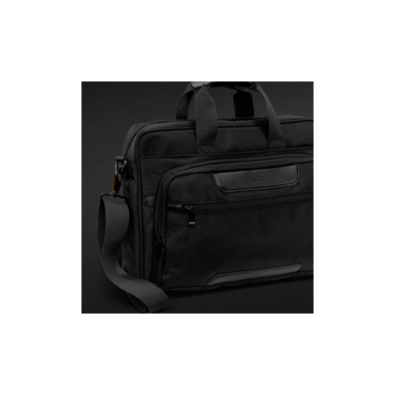 600D polyester with heavy vinyl backing standard briefcase. Main compartment with zippered closure, front flap has zippered pocket with dual buckle closure, various sized slip pockets and pen pockets under front flap, single carrying handle, adjustable and removable shoulder strap.