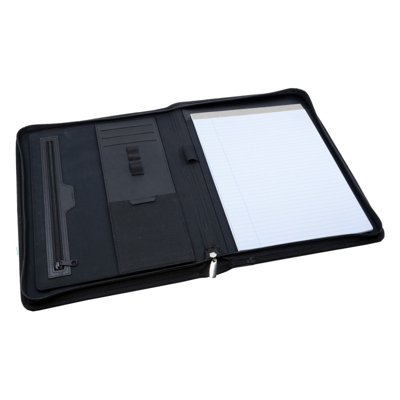Zippered closure. Interior organiser with gusseted file pocket, business cards, calculator & front pockets.