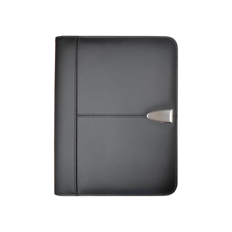 Black bonded leather with brushed silver badge, 3 x 20mm removable snap rings, A4 notepad, pen loop and business card pockets. Optional dual powered calculator D980.
