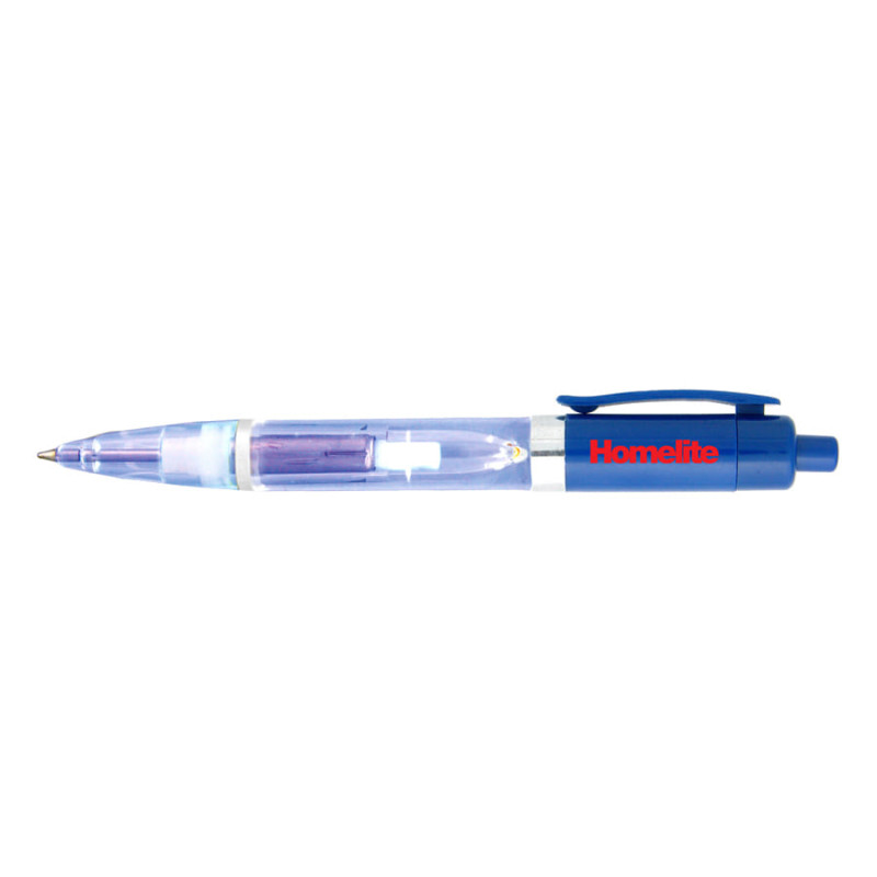 Plastic light up pens in 4 colours with LED light in the barrel and black ink.