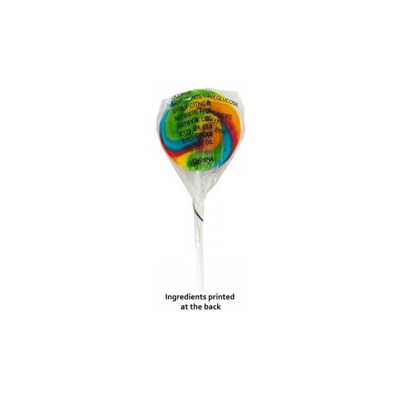 Medium Candy Lollipop With Sticker Adhered To Wrapper. ingredient information Printed On The Reverse Side Of Bag