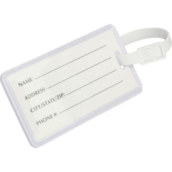 Luggage tag with clear PVC window and spaghetti loop strap. PVC window on back holds contact detail insert (included).