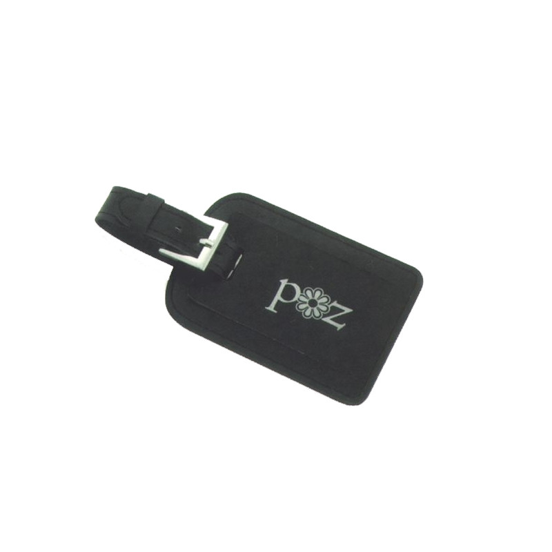 Luggage tag with black flexi PVC strap with moulded PVC 2D or 3D custom design on front. Back has black rigid plastic frame with clear window featuring removable paper label for contact details. Price includes up to 3 colour design plus base PVC colour, one side only.