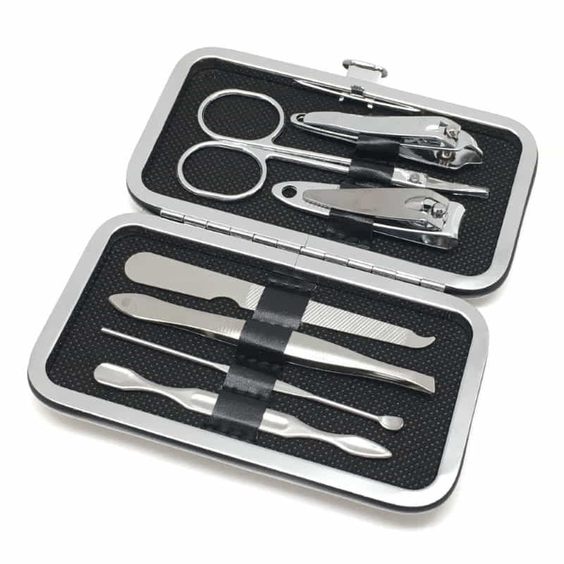 The Executive 8-Piece Manicure Set is a deluxe, zippered travel manicure set with 8 stainless steel grooming tools inside. Includes mini-scissors, 2 cuticle tools, tweezers, nail file, 1 standard nail clipper, 1 large nail clipper and 1 curved nail/cuticle clipper.