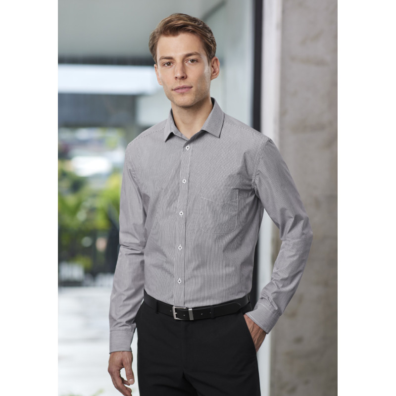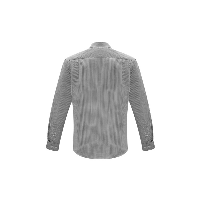 Modern collar, chest pocket, twin back pleats and adjustable cuff,Curved hem can be worn in or out. Fabric: Easy Care 65% Polyester, 35% Cotton,Yarn dyed fine stripe fabric,UPF rating - Very Good.
