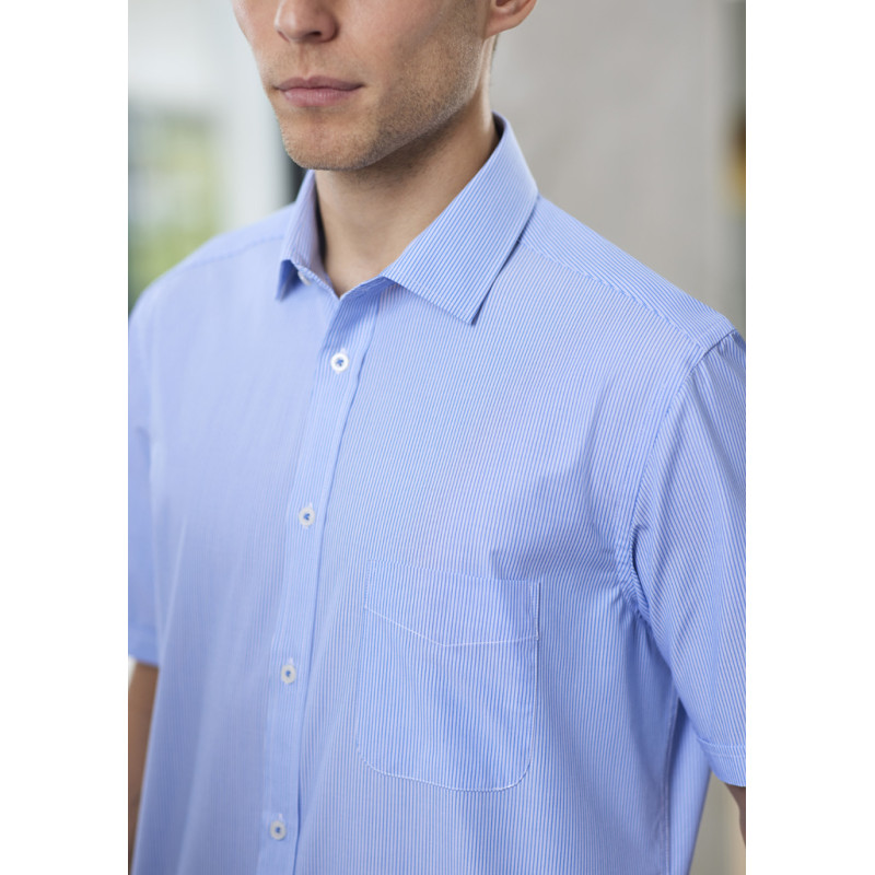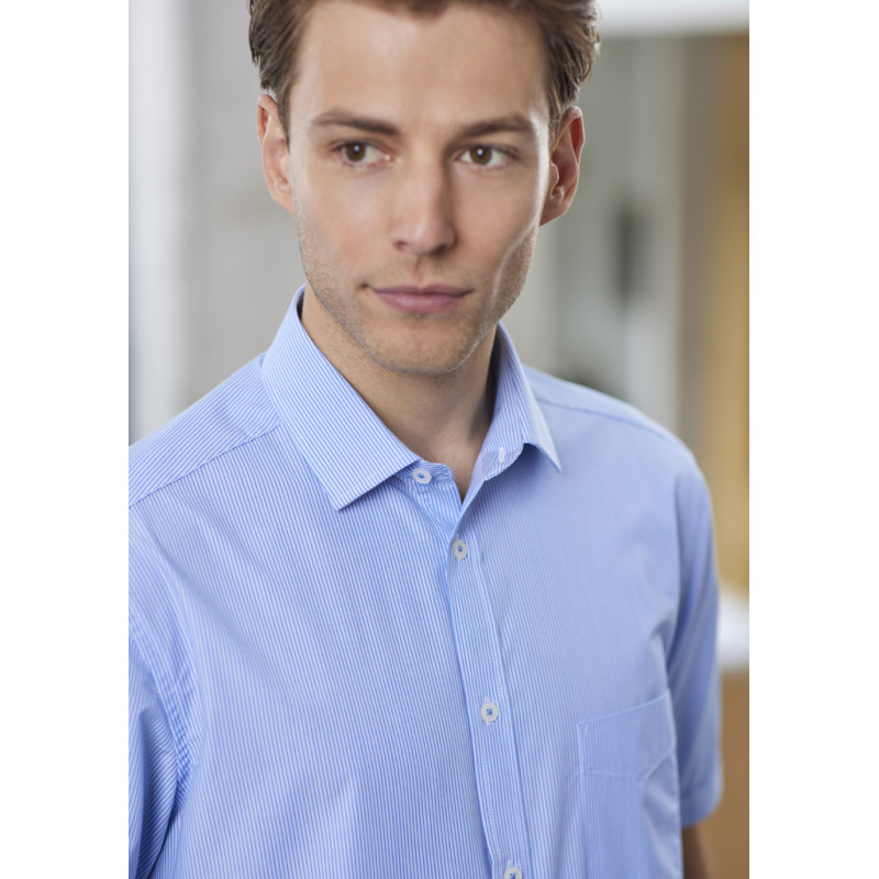 Modern collar, chest pocket, twin back pleats and adjustable cuff,Curved hem can be worn in or out. Fabric: Easy Care 65% Polyester, 35% Cotton,Yarn dyed fine stripe fabric,UPF rating - Very Good.