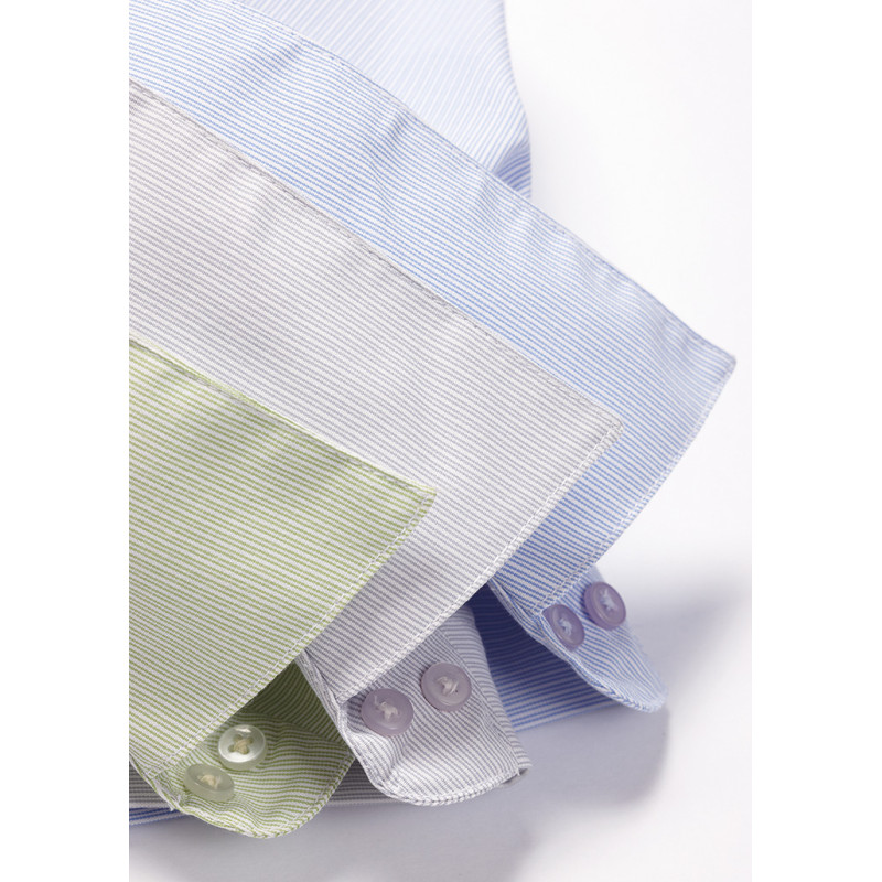 Twin back shoulder pleats for movement,Adjustable 2 button cuff. Fabric: Easy Care, easy iron, 65% Polyester, 35% Cotton,Self stripe pattern with new modern narrow collar style.