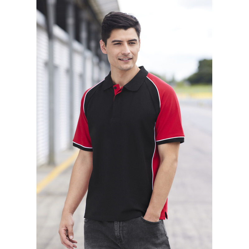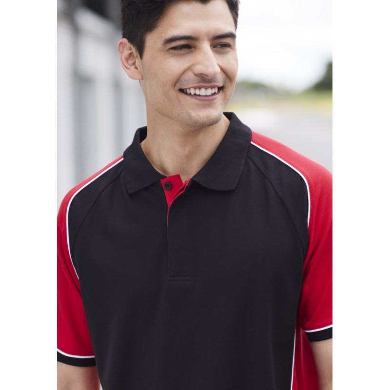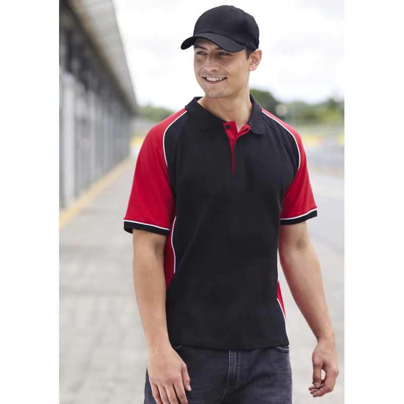 Honeycomb weave with stretch elastane delivers style and comfort,Flat knitted collar with contrast button placket,Side panels with dynamic contrast piping,Unique print features on torso, sleeve and back neck to accent your logo,Longer length for added coverage when moving,Mens style includes loose pocket. Fabric: 97% Polyester, 3% Elastane,180 GSM,BIZ...