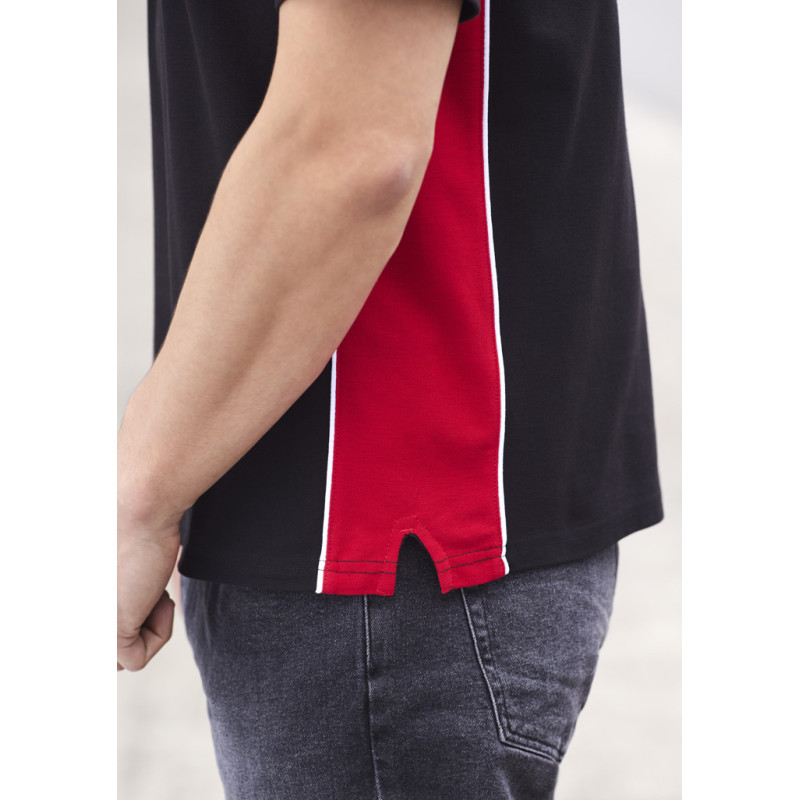 Contrast hem panel detail,New slim knitted stripe collar and cuff,Loose pocket included. Fabric: 50% Cotton inner, 50% BIZ COOL Polyester Pique Outer,170 GSM,UPF rating - Good.