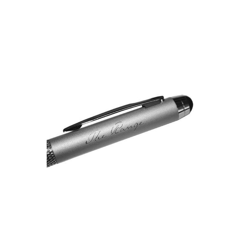 Soft feel, aluminium coloured barrel ballpoint pen with Black accents. This pen can be laser engraved in a silver mirror finish. Optional black suede velvet pouch.Writing distance: 2.1 kilometres. TC roller ball. Nero pigment ink. Aluminium with rubber oil coating