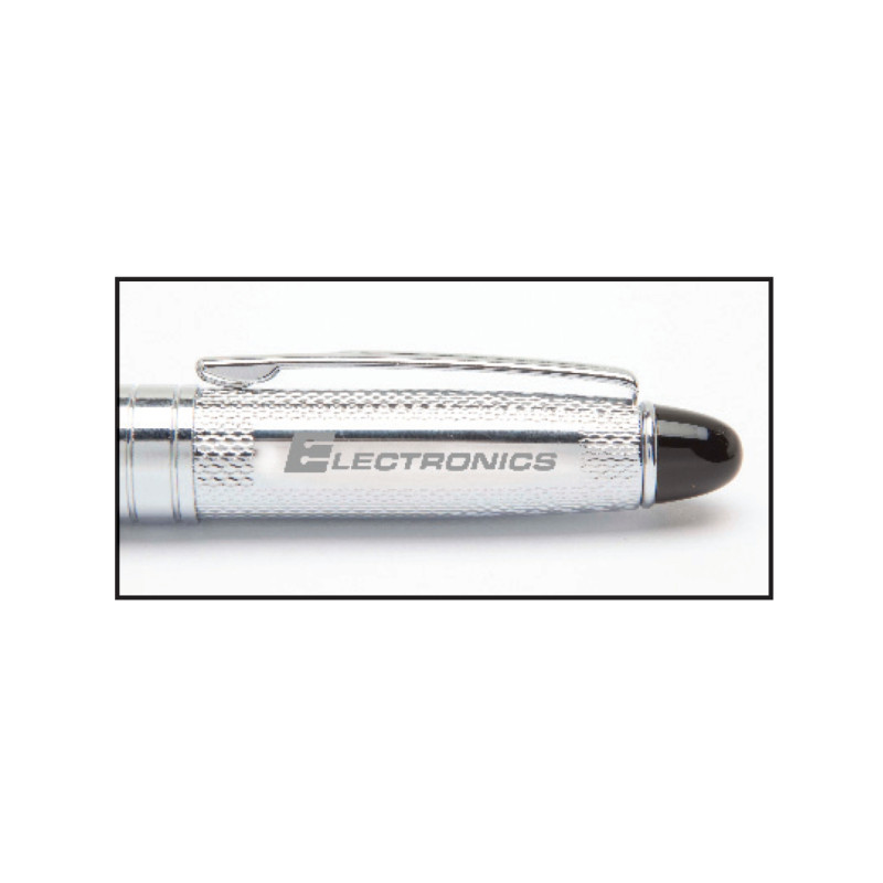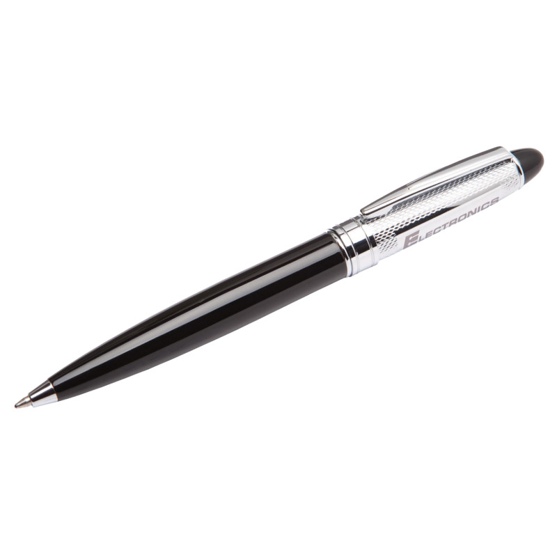 Push button ballpoint pen with black ink and black stylus. Aluminium soft feel barrel. Chrome clip and tip & highlight rings on the barrel. Writing distance: 2.1 kilometres.