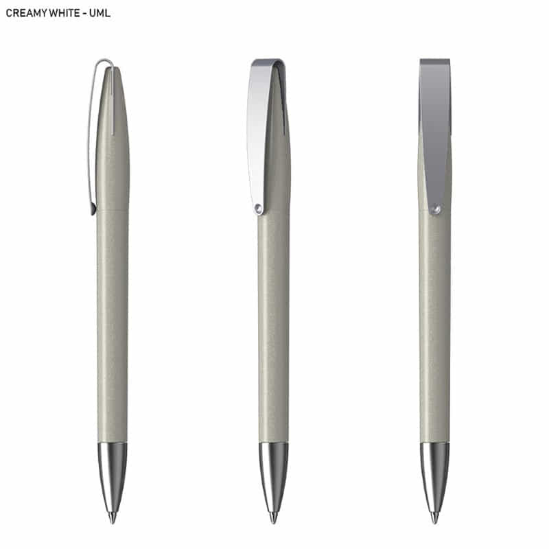 Retractable aluminium ballpoint pen with a painted gloss white barrel, shiny chrome accents and a coloured silicone grip with matching end cap. It has a large volume refill with 1200 metres of black German manufactured Dokumental ink. Panama can be presented in an optional pen sleeve or a gift box.