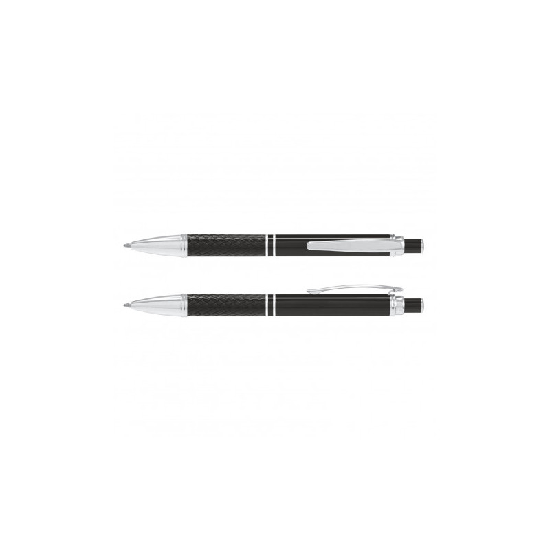 Push button ballpoint pen with black ink and black stylus. Aluminium soft feel barrel. Chrome clip and tip & highlight rings on the barrel. Writing distance: 2.1 kilometres.
