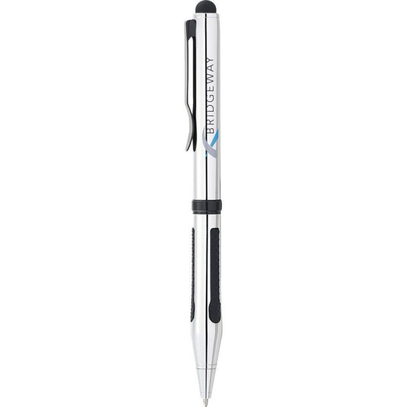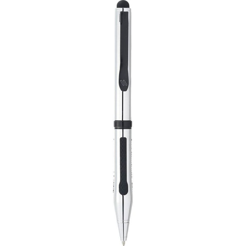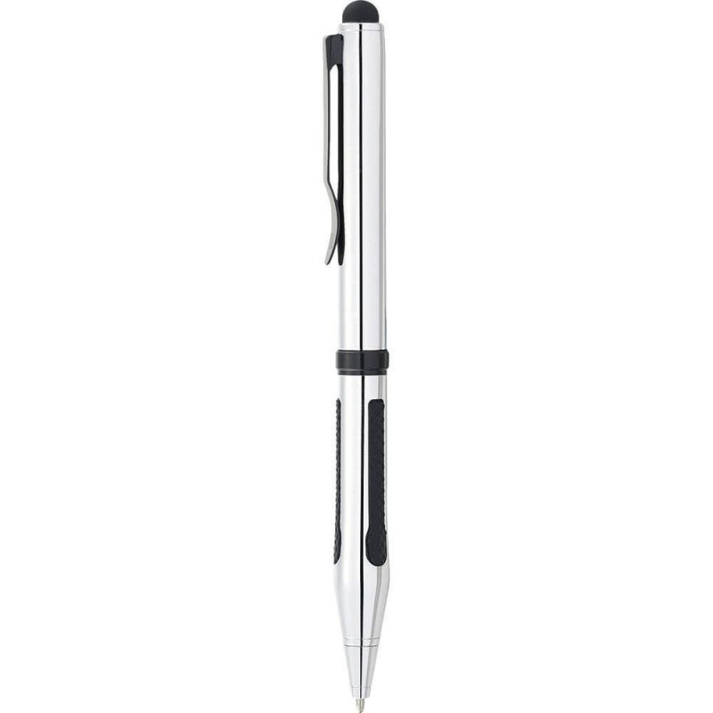 Push button ballpoint pen with black ink and black stylus. Aluminium soft feel barrel. Chrome clip and tip & highlight rings on the barrel. Writing distance: 2.1 kilometres.