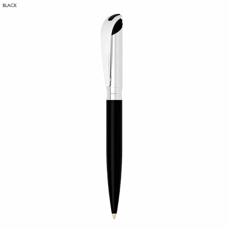 Push button ballpoint pen with black ink and black stylus. Aluminium soft feel barrel. Chrome clip and tip & highlight rings on the barrel. Writing distance: 2.1 kilometres.