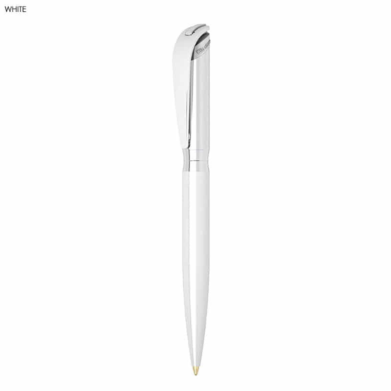 Retractable aluminium ballpoint pen with a painted gloss white barrel, shiny chrome accents and a coloured silicone grip with matching end cap. It has a large volume refill with 1200 metres of black German manufactured Dokumental ink. Panama can be presented in an optional pen sleeve or a gift box.
