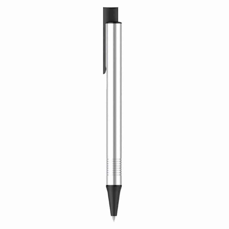 Soft feel, aluminium coloured barrel ballpoint pen with Black accents. This pen can be laser engraved in a silver mirror finish. Optional black suede velvet pouch.Writing distance: 2.1 kilometres. TC roller ball. Nero pigment ink. Aluminium with rubber oil coating