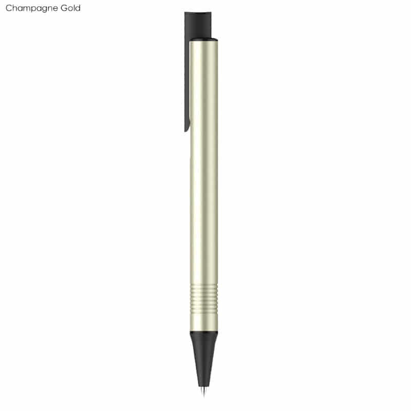 Push button, gloss finish aluminium pen with gold highlights and black ink. This pen can be laser engraved to a shiny gold finish. Writing distance: 2.1 kilometres.