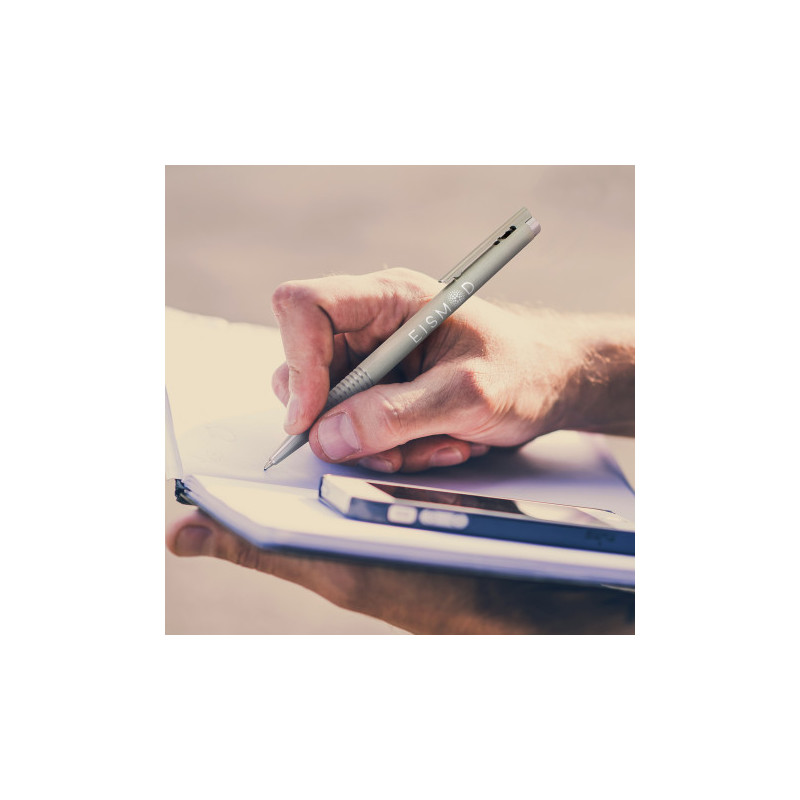 Aluminium barrel ballpoint pen with silver accents. Writing distance: 2.1 kilometres.