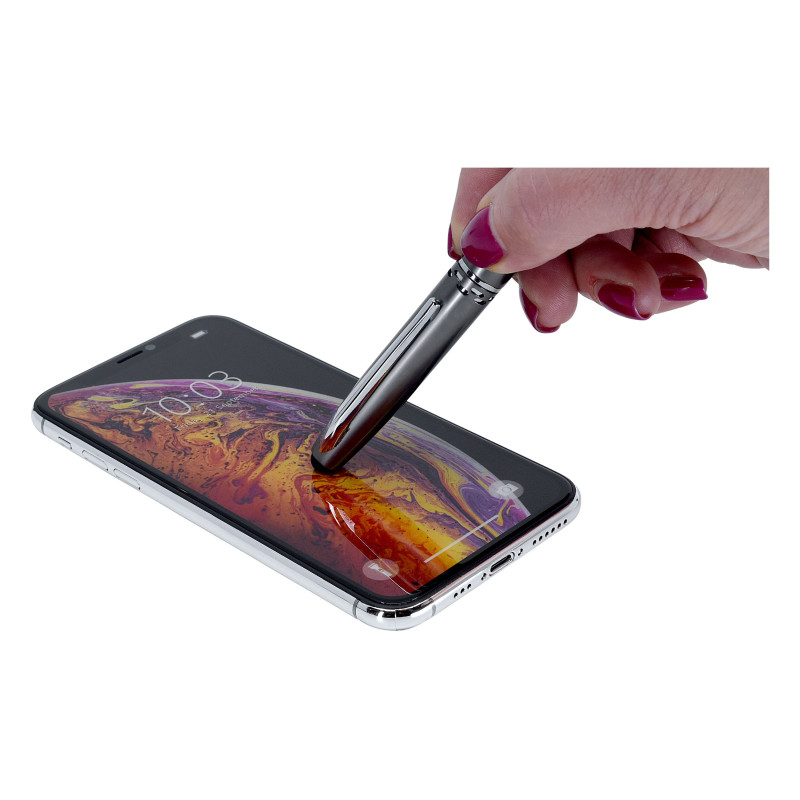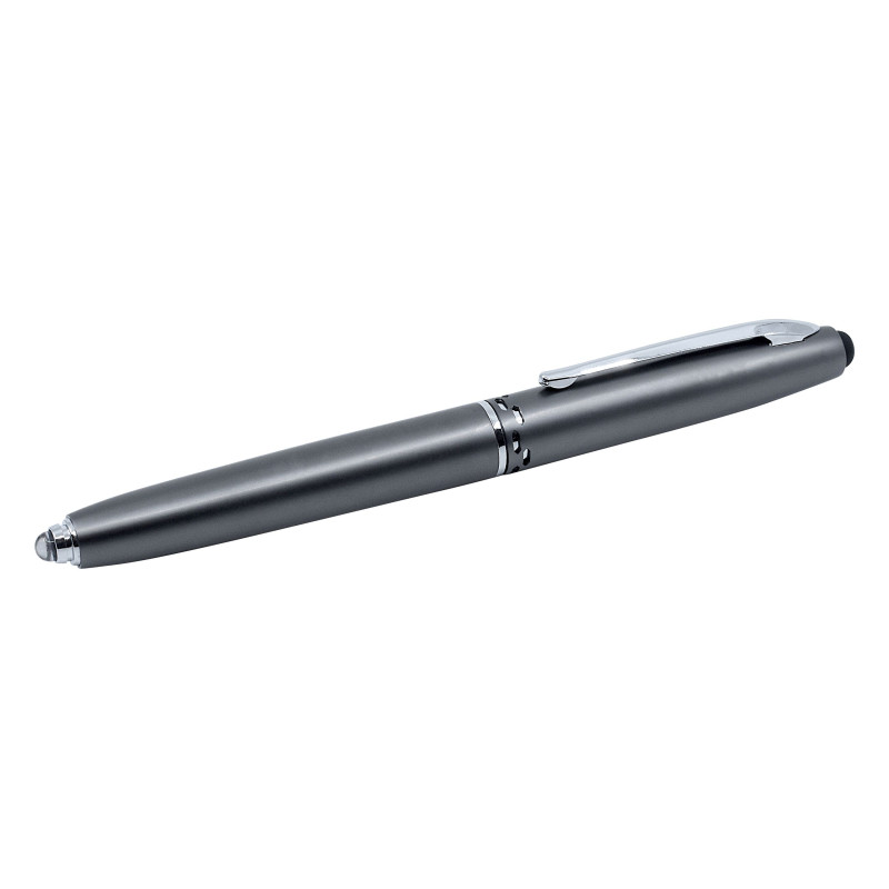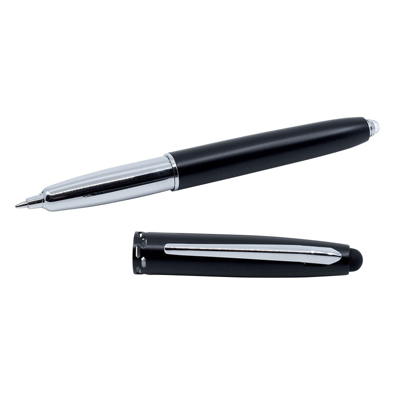 Push button ballpoint pen with black ink and black stylus. Aluminium soft feel barrel. Chrome clip and tip & highlight rings on the barrel. Writing distance: 2.1 kilometres.