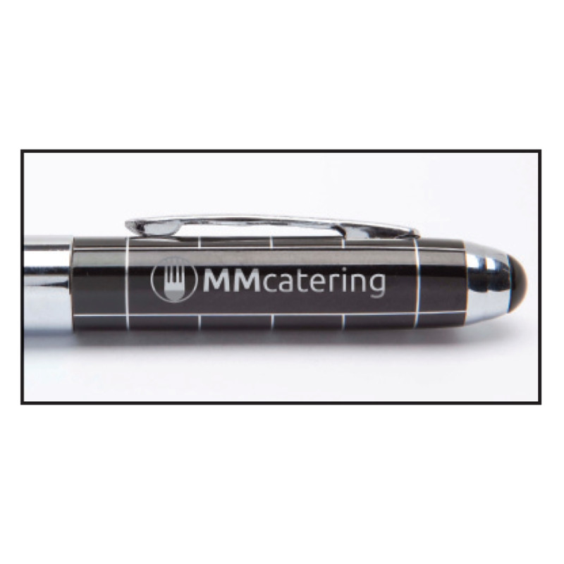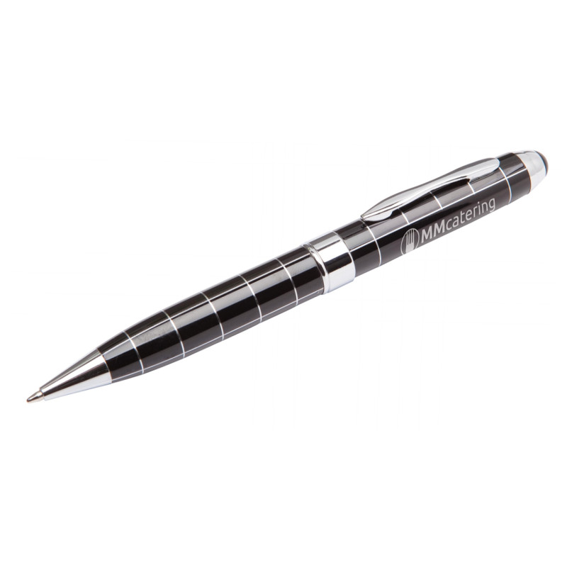 Push button ballpoint pen with black ink and black stylus. Aluminium soft feel barrel. Chrome clip and tip & highlight rings on the barrel. Writing distance: 2.1 kilometres.