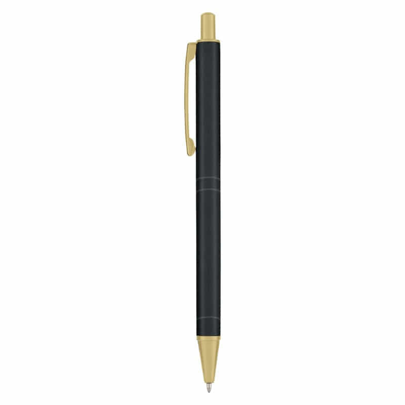 Push button, gloss finish aluminium pen with gold highlights and black ink. This pen can be laser engraved to a shiny gold finish. Writing distance: 2.1 kilometres.