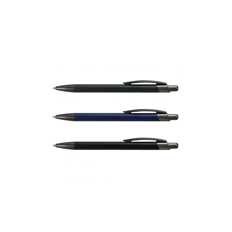 Push button ballpoint pen with black ink and black stylus. Aluminium soft feel barrel. Chrome clip and tip & highlight rings on the barrel. Writing distance: 2.1 kilometres.