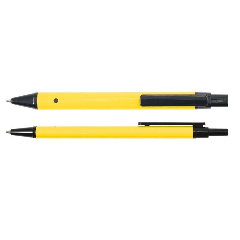 Push button, gloss finish aluminium pen with gold highlights and black ink. This pen can be laser engraved to a shiny gold finish. Writing distance: 2.1 kilometres.