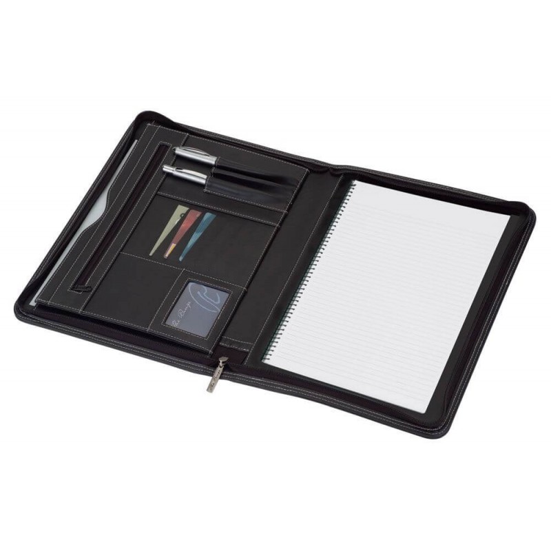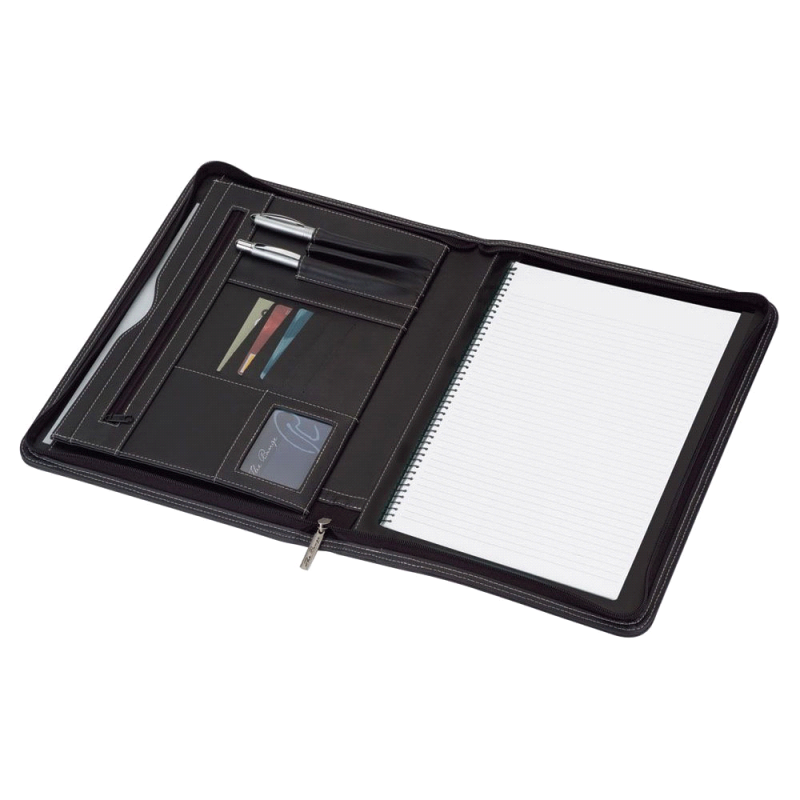 Professional portfolio manufactured from PU with removable metal ring binders. It features a zippered closure for added security and convenience. The portfolio also includes internal loops for pens and flash drives, as well as large document slips and three business card holders.