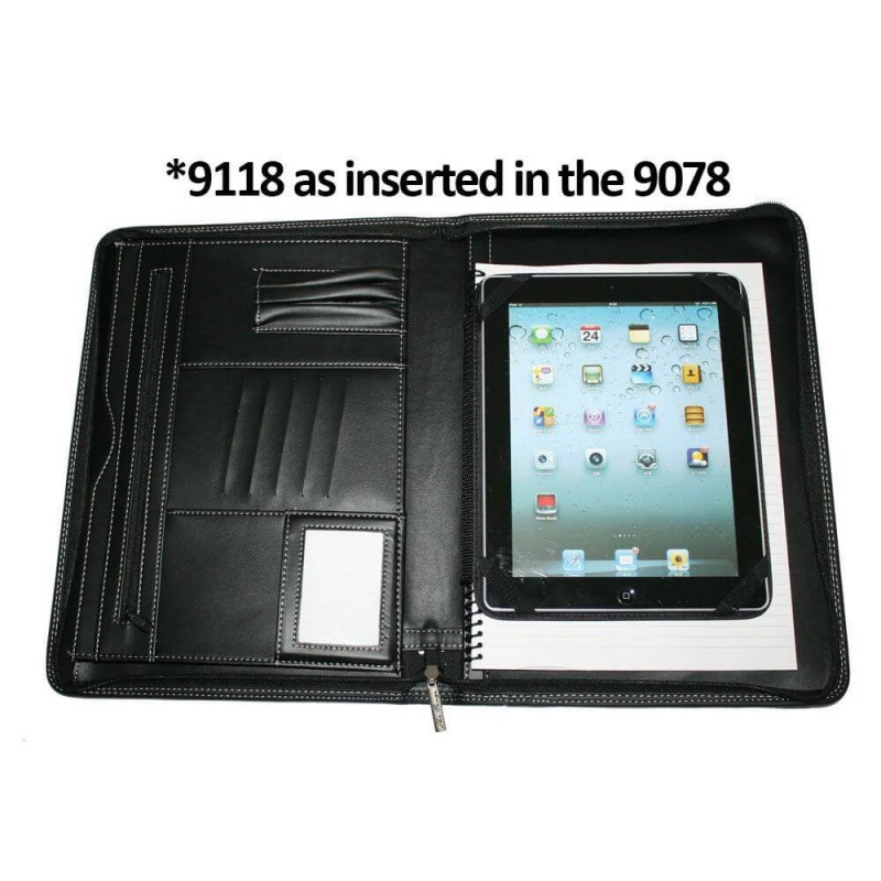 Zippered closure. Tech Trap elastic interior organizer. Holds an iPad. Front cover access pocket with business card holders and media organizers. (Pens, iPad and other devices shown are not included)