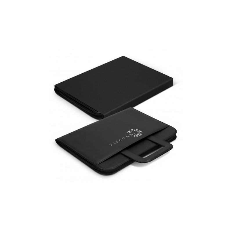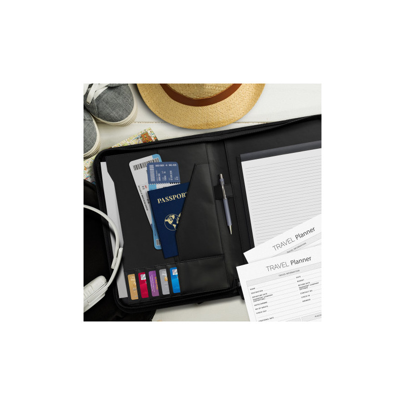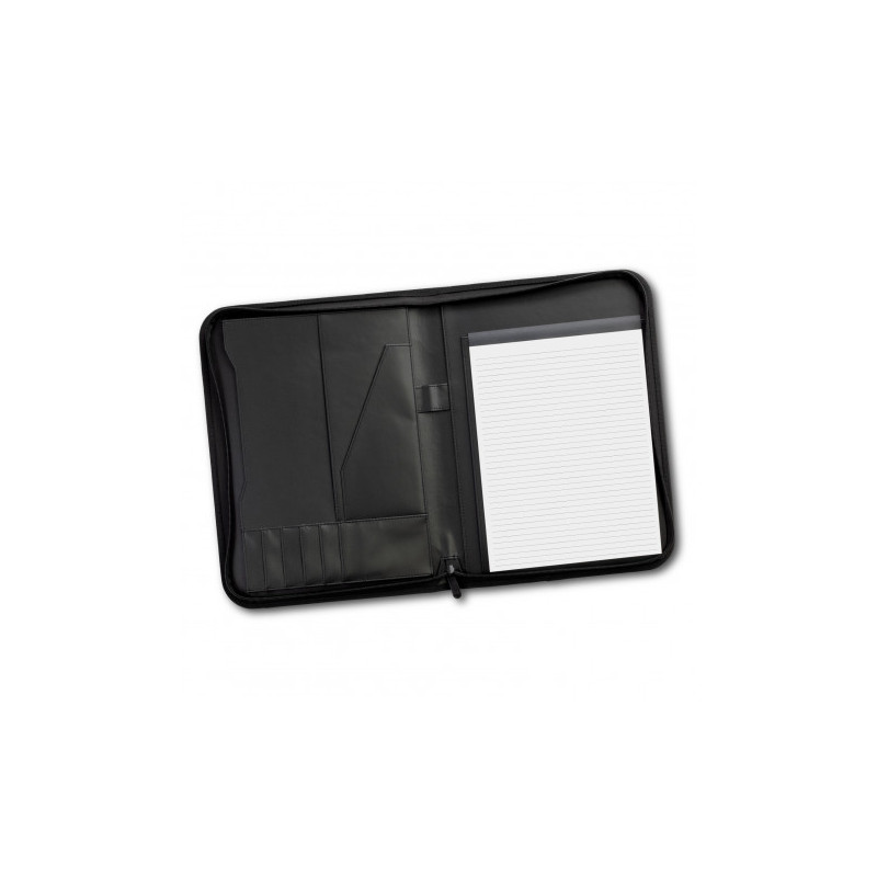 Stylish A4 compendium with solar calculator. Zippered closure. Includes refillable 30 page writing notepad. Front open document pocket. Internal expanding pocket, zippered pocket and pen loop. Pen not included.