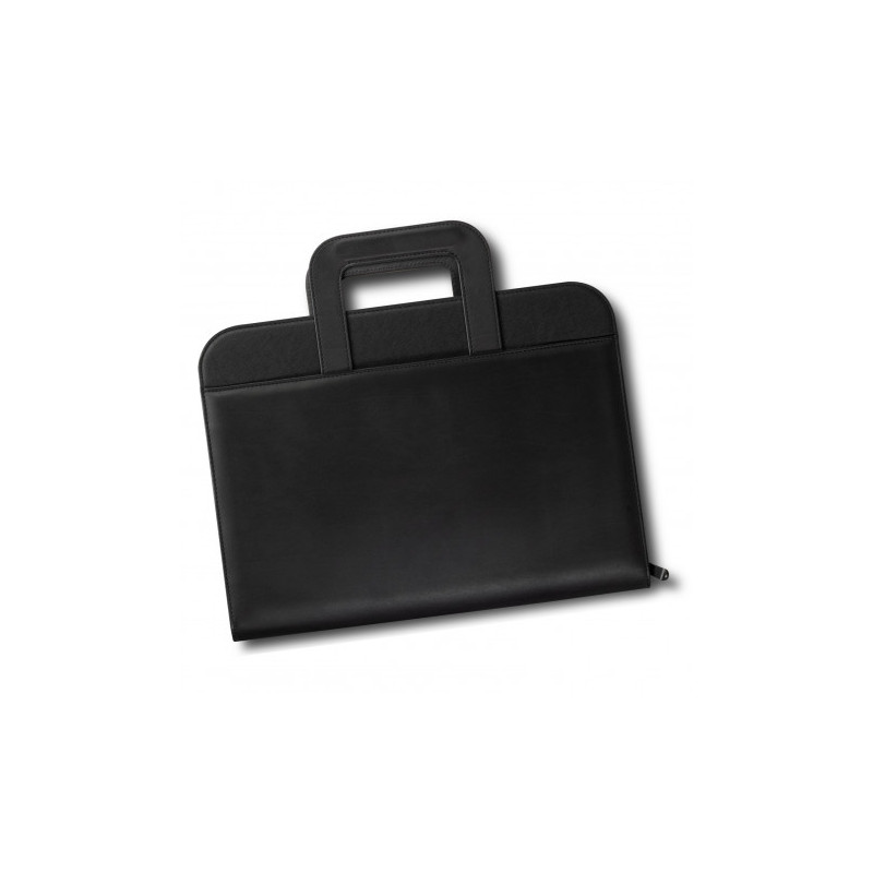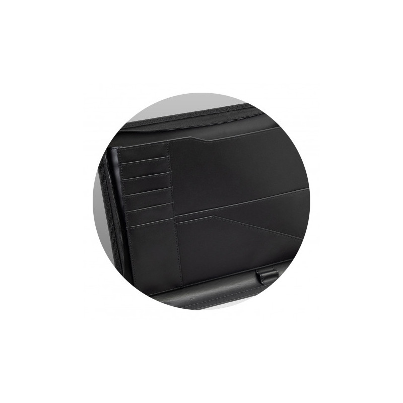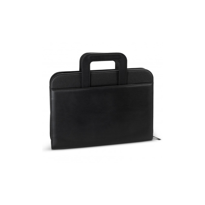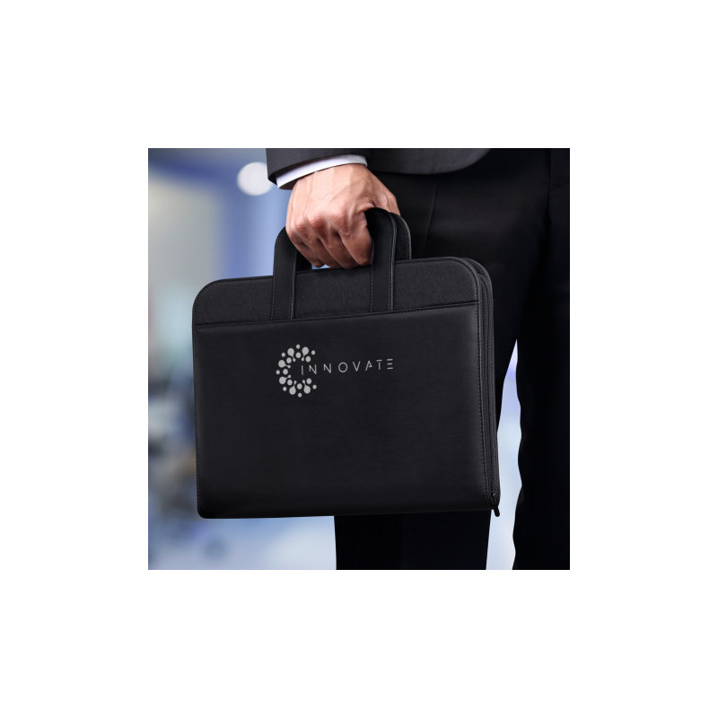 Professional portfolio manufactured from PU with removable metal ring binders. It features a zippered closure for added security and convenience. The portfolio also includes internal loops for pens and flash drives, as well as large document slips and three business card holders.