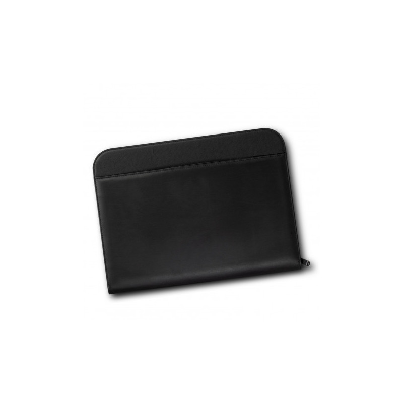 A sophisticated leather portfolio made of bonded leather. It has a zippered closure and a curved front design. A large document slip pocket, A4 lined paper, and internal compartments for a pen, power bank, phone, tablet, and business card are included in the portfolio.