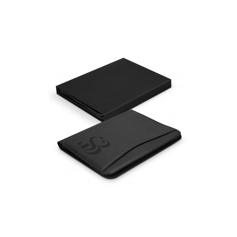 Stylish A4 compendium with solar calculator. Zippered closure. Includes refillable 30 page writing notepad. Front open document pocket. Internal expanding pocket, zippered pocket and pen loop. Pen not included.