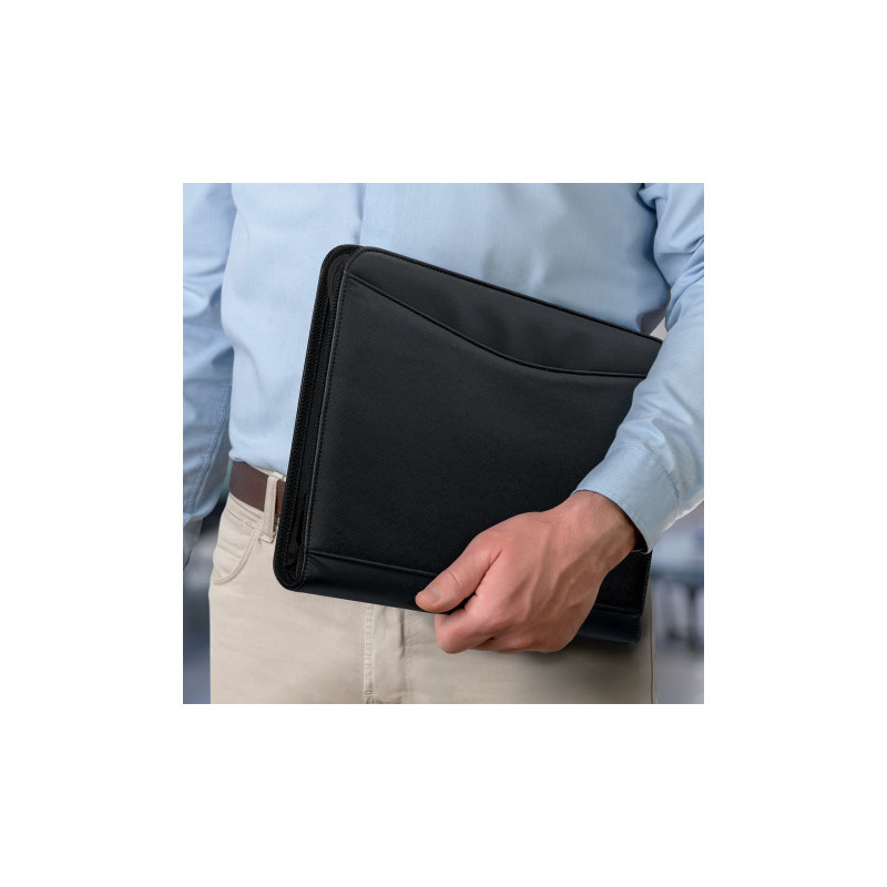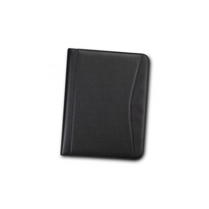 A sophisticated leather portfolio made of bonded leather. It has a zippered closure and a curved front design. A large document slip pocket, A4 lined paper, and internal compartments for a pen, power bank, phone, tablet, and business card are included in the portfolio.