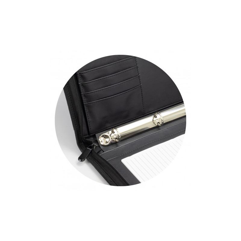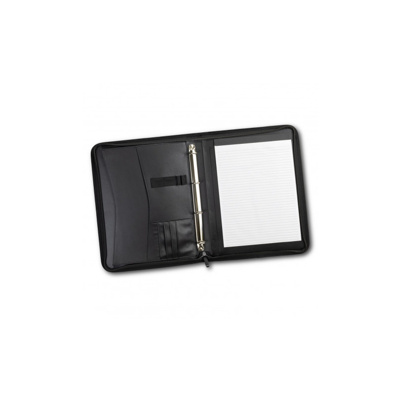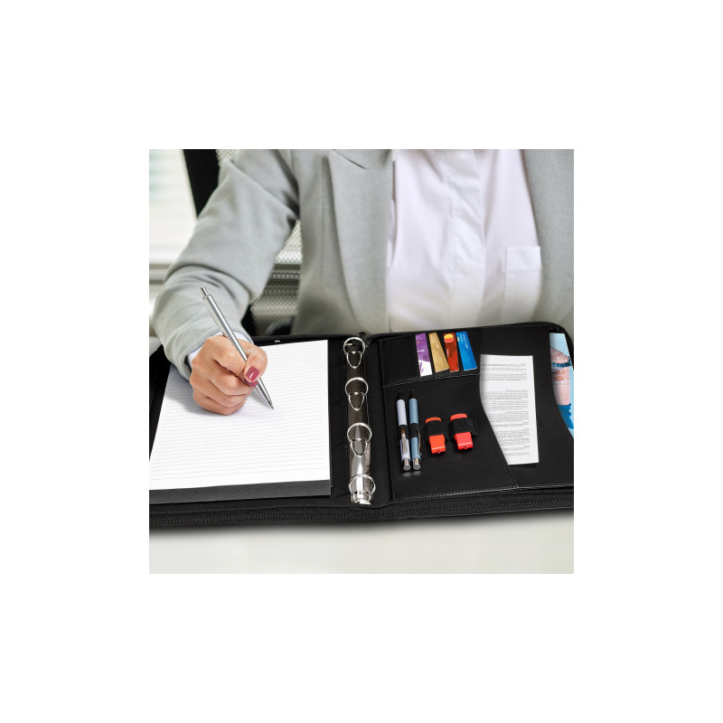 Compendium with soft touch Ultra Hyde finish with A4 lined notepad, zippered internal pocket, pen loop, business card pockets, 3 x 20mm removable snap rings and outside pocket on back.