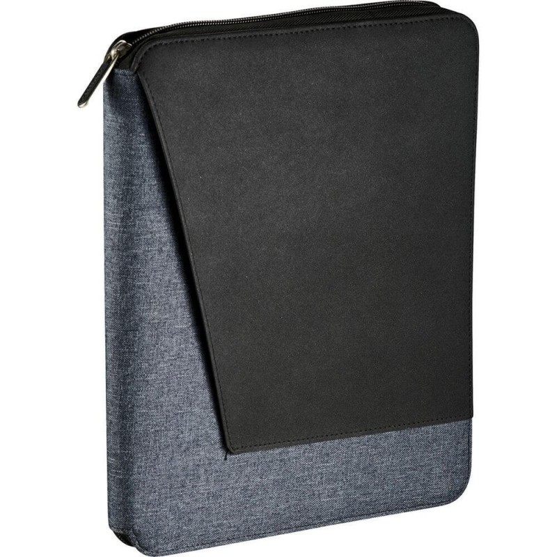 A4 tech portfolio notebook with polyester fabric, magnetic closure, mobile phone stand, elasticised pockets and business card holder. Includes 50 ruled pages. Badge has a Mirror Finish when Laser Engraved.