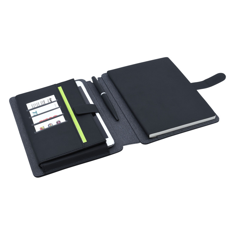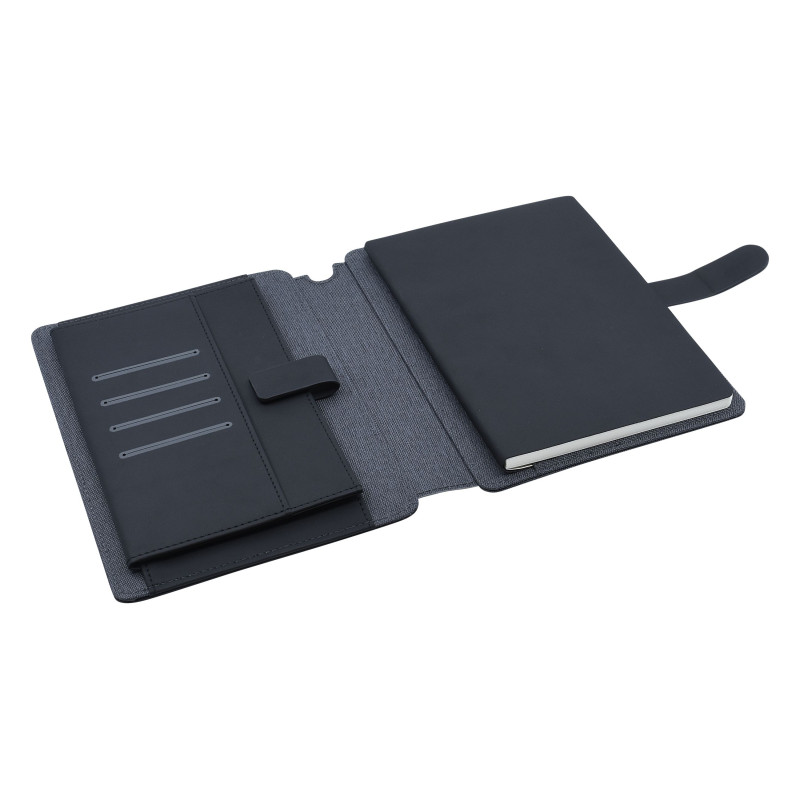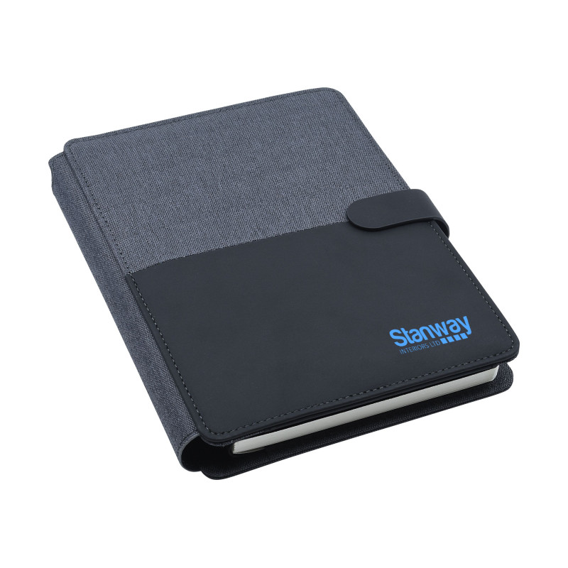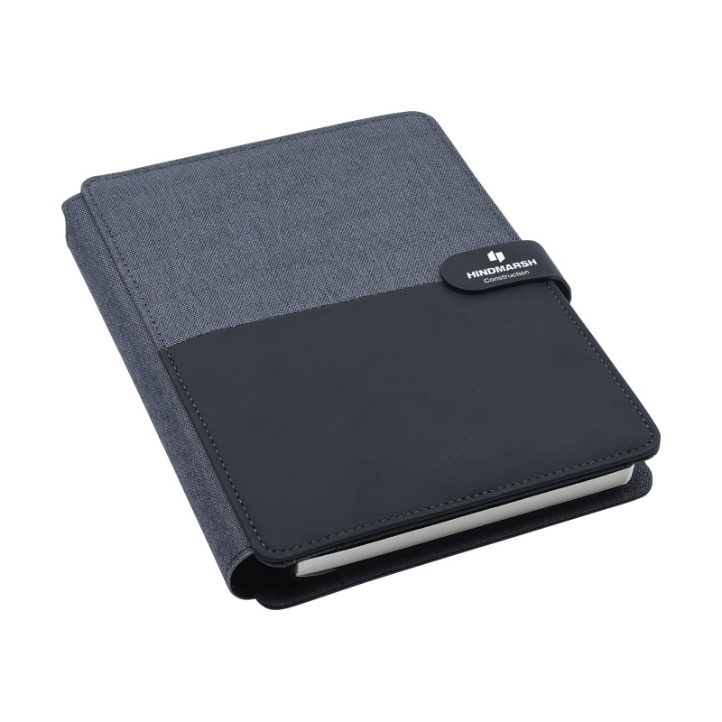A4 tech portfolio notebook with polyester fabric, magnetic closure, mobile phone stand, elasticised pockets and business card holder. Includes 50 ruled pages. Badge has a Mirror Finish when Laser Engraved.