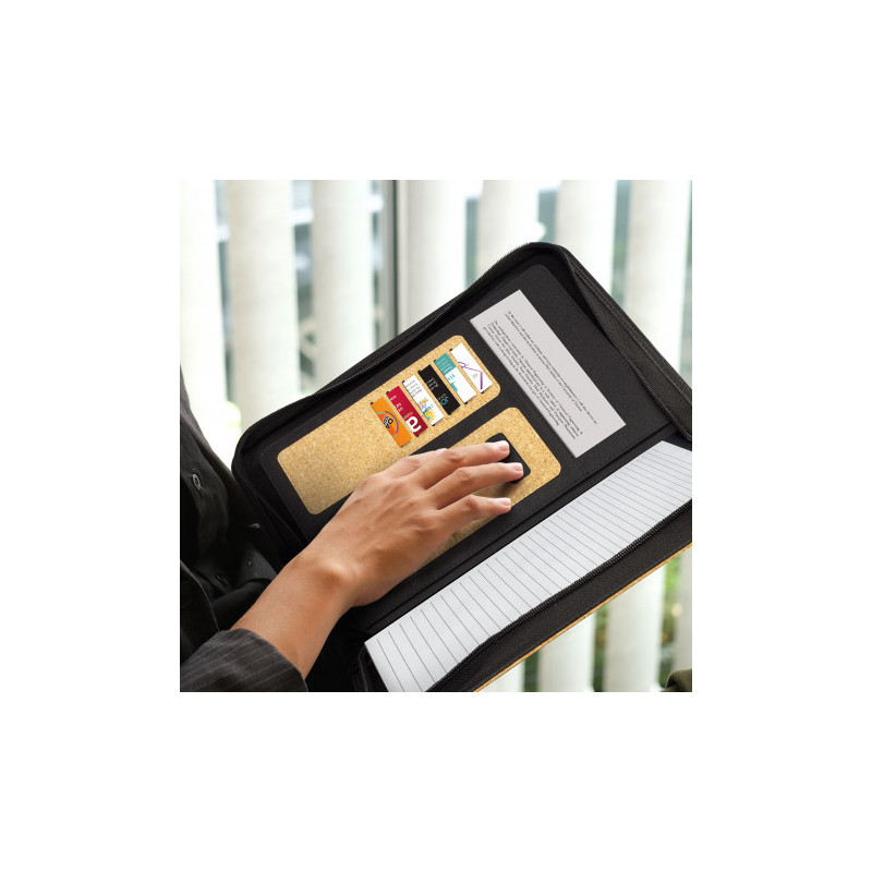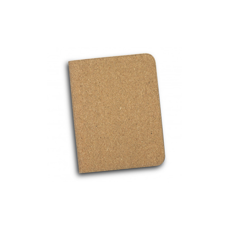 Modern A5 Portfolio, manufactured from cork with an elastic PU strap for secure closure. Other features include a lined paper pad, a pen holder, five business card slots, a pocket for notes and a slip side pocket for documents. When cork is harvested only the outer bark is removed from the tree. This allows the tree to continue growing and replenishing...