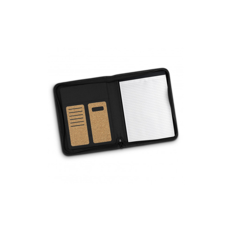 Stylish A4 compendium with solar calculator. Zippered closure. Includes refillable 30 page writing notepad. Front open document pocket. Internal expanding pocket, zippered pocket and pen loop. Pen not included.